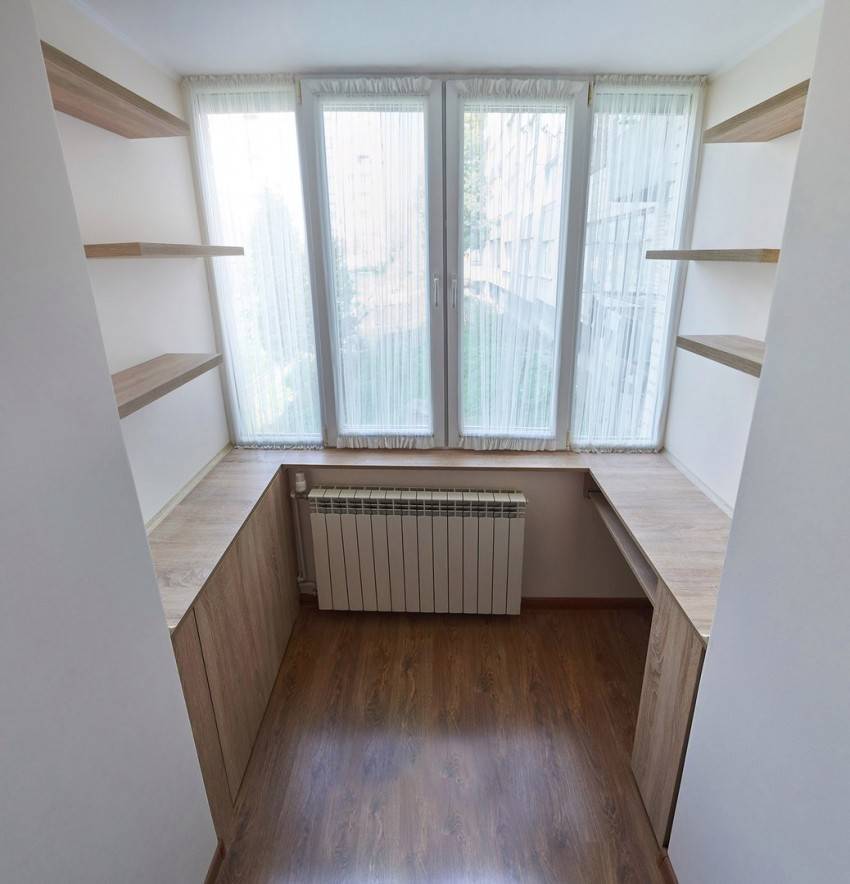 В узком пространстве не рационально размещать полки вдоль подоконника. Лучше встроить шкаф или собрать стеллаж с одного торца, а напротив закрепить многоуровневые полки. Для не застекленных балконов подойдут металлические модели стеллажей, для закрытых – пластик и ДСП.