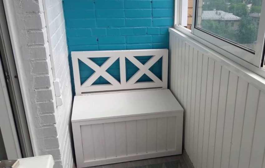 Самая простая скамья-ящик для балкона будет выглядеть как коробка из ДСП с открывающейся верхней крышкой на петлях. Все внутреннее пространство скамьи будет служить местом для хранения вещей.