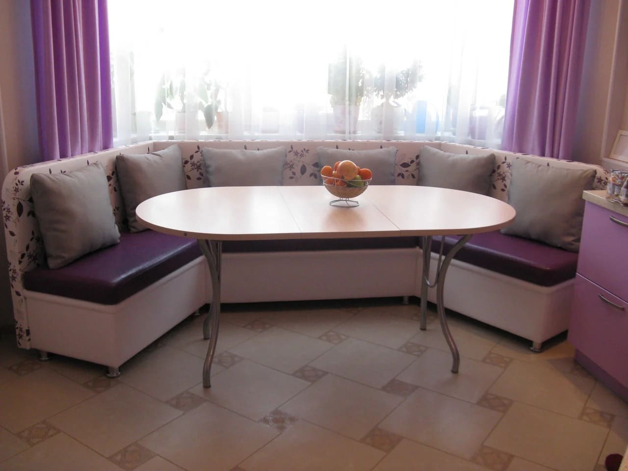 Она может быть прямоугольной, полукруглой или нестандартной формы. С помощью эркерного дивана максимально заполняется свободное пространство. Обивку такой модели выбирайте светлого, нежного оттенка. Если кухня совмещена с балконом, лучший вариант расположения мягкой мебели со столом – возле окна. Такое расположение создаст комфортную зону для принятия пищи