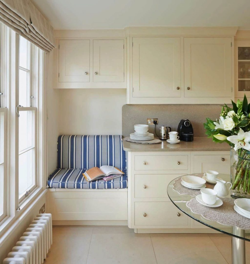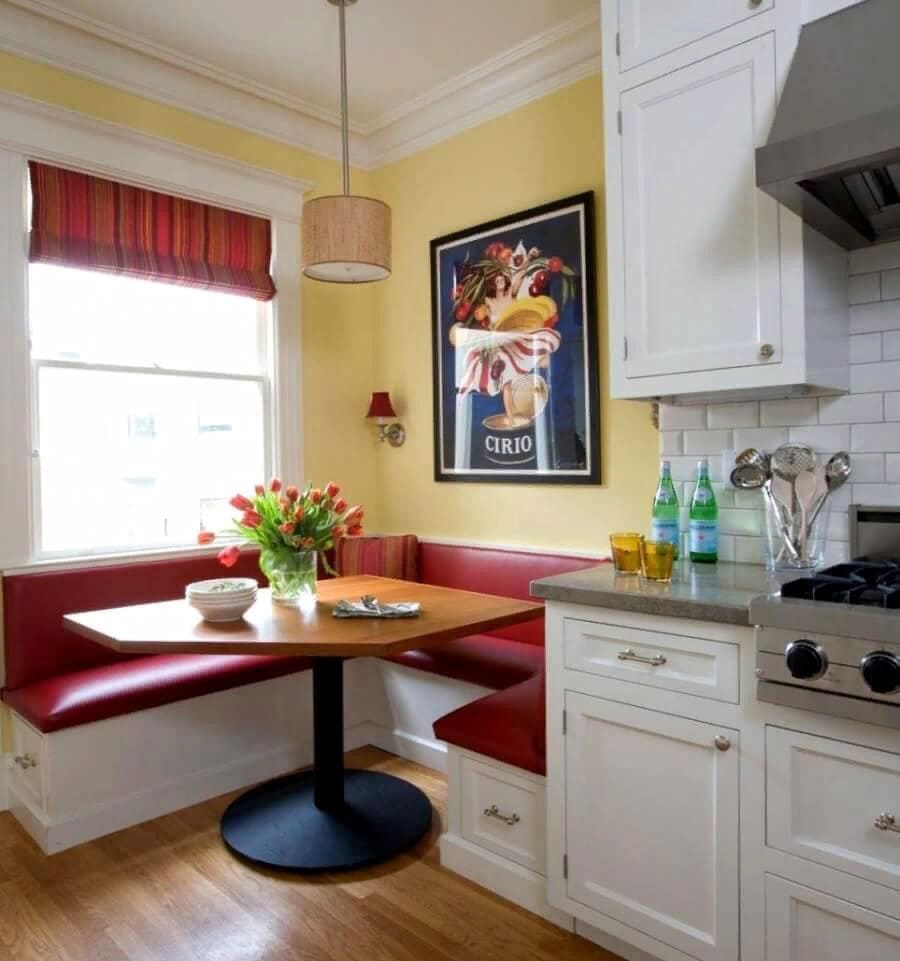 В маленькой кухне компактный встроенный диванчик также позволит сделать пустующий угол функциональным, удобным и уютным. Он может продлевать линию кухонных шкафов или использовать противоположный угол.