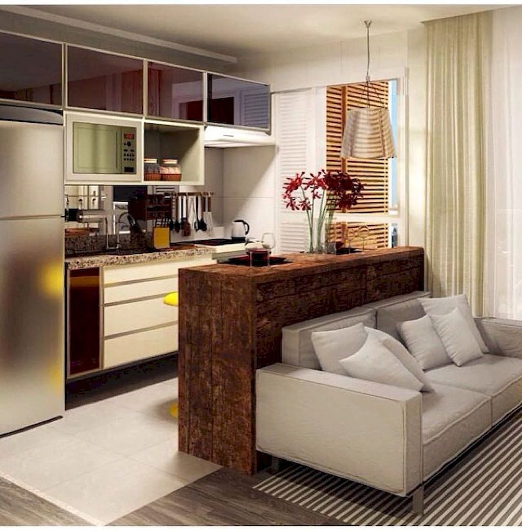 В прямоугольной удлиненной комнате часто зона отдыха располагается под окном в торце. Кухня занимает более темную долю помещения, где в любом случае нужен дополнительный свет. Кухонный гарнитур может быть параллельным, угловым. Органично отделит эту часть небольшая барная стойка, которая займет меньше места, чем обычный стол со стульями или даже табуретками.