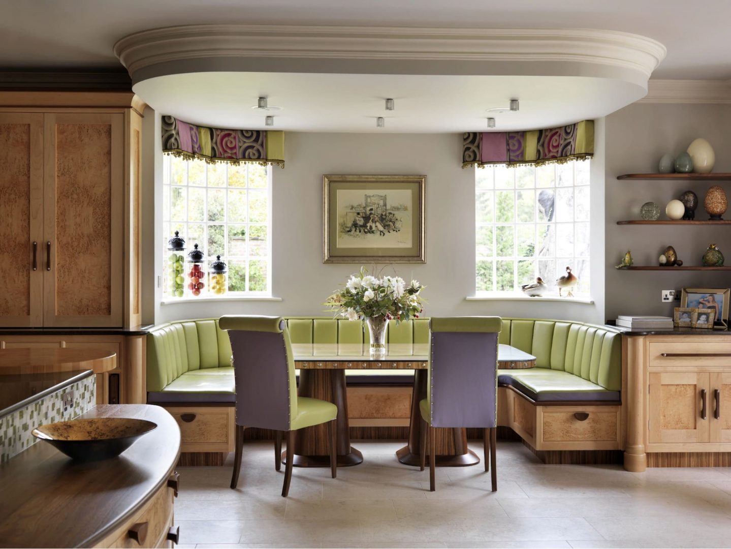 Обладателям кухонь с эркером повезло: выступающий фрагмент фасада позволяет немного увеличить площадь. Ориентируясь на размеры и конфигурацию выступа, по спецпроекту можно изготовить угловой диван, подходящий именно для данной кухни. Зрительно расширив пространство и максимально сгладив углы, он сделает интерьер интереснее.