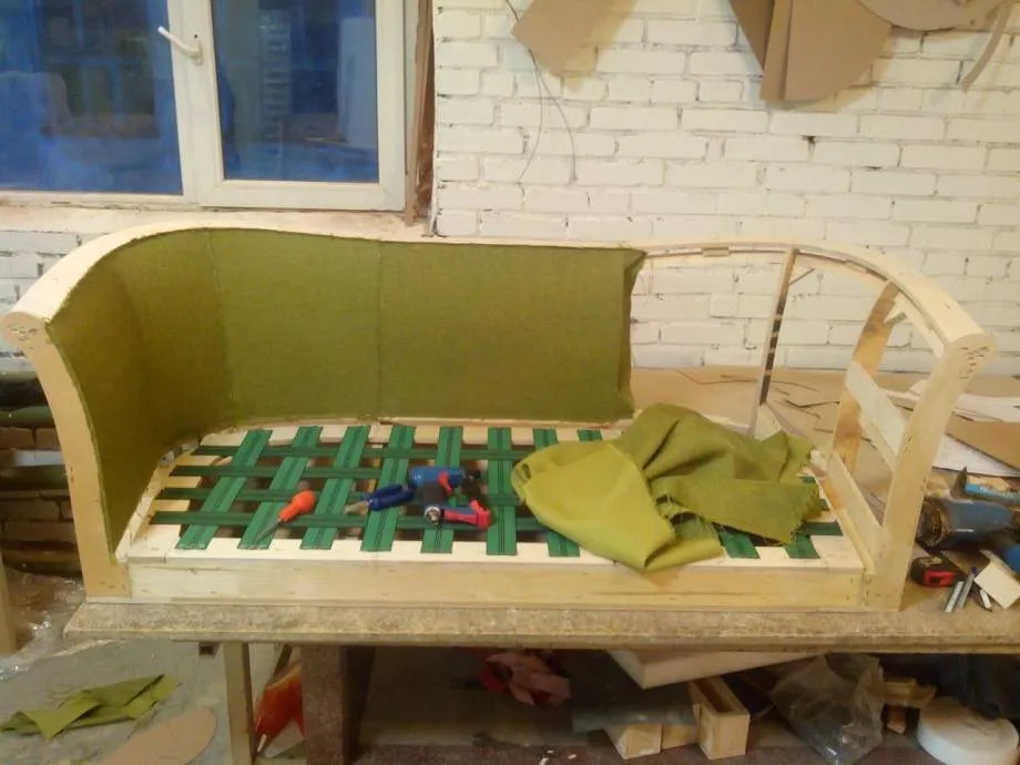 Когда все детали выкроены, предварительно произведен ремонт каркаса, поменяны пружины, стоит новый ватин, только тогда можно приступать к подгонке тканевого чехла.