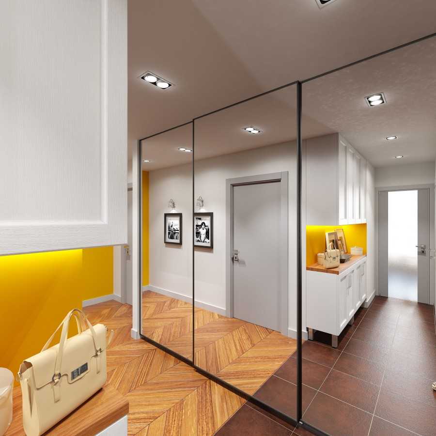 Проведём перепланировку четырёхкомнатной квартиры с узкой длинной прихожей. Одна стена позволяет расположить высокий (в потолок) шкаф-купе с зеркальными раздвигающимися дверцами и довольно большой комод.