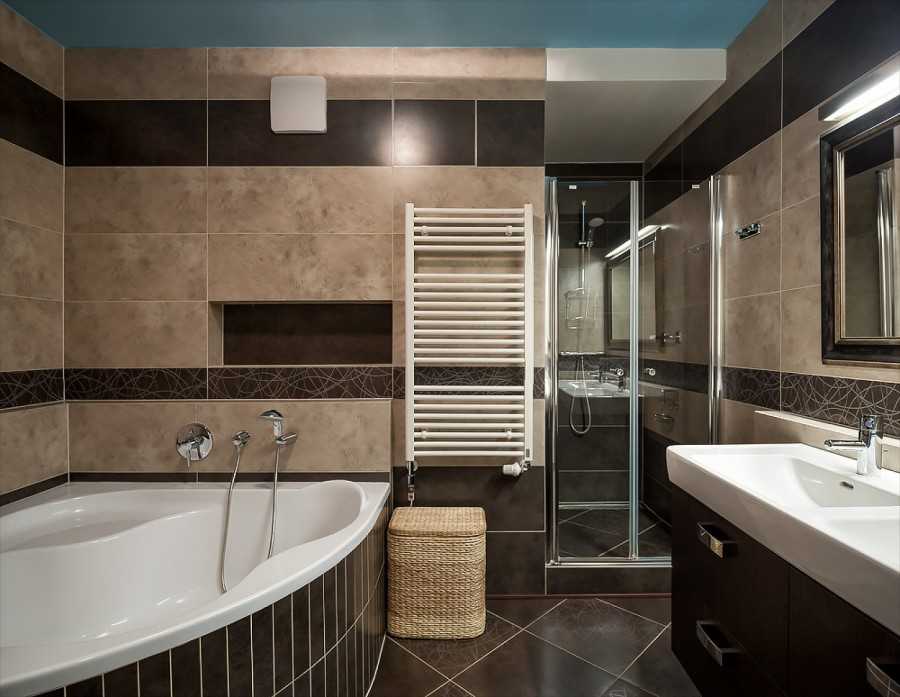 Помещение ванны относительно просторное, хорошо, если имеется оконный проём, который выгодно пропускает естественный свет. Здесь, обычно, расположены лишь все строго необходимые вещи: душевая кабинка, стиральная машинка, раковина.