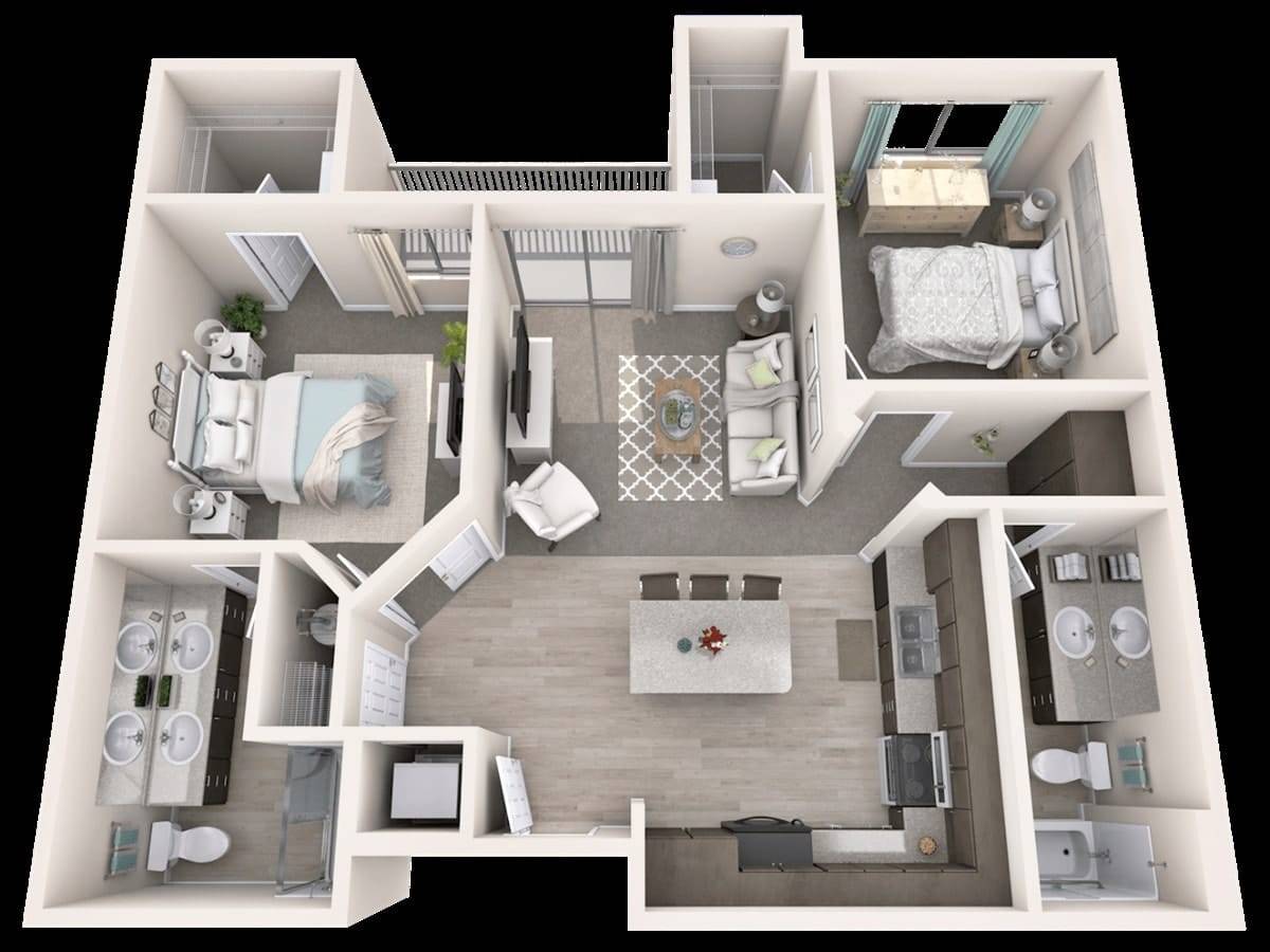 Эта практичная планировка трехкомнатной квартиры площадью 110 квадратных метров имеет две спальни, в каждой из которых есть ванная комната и гардеробная. Кухня не имеет окна, но спроектирована в американском стиле – с островом и столовой на четыре персоны. В гостиной двери на балкон решены в формате дверей-слайдеров со стеклами от пола до потолка.