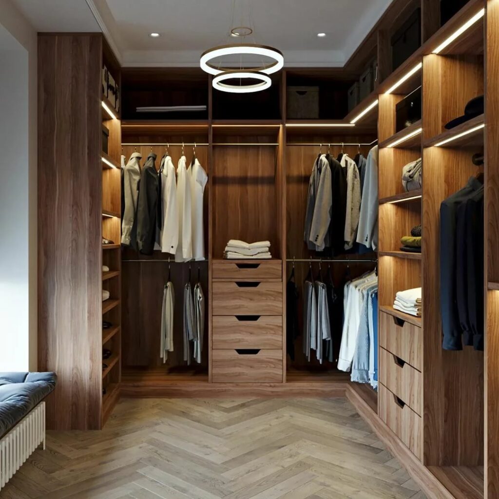 Важно сделать так, чтобы светильники не нагревались, иначе вещи испортятся. Светодиодное освещение – идеальный вариант для гардеробной