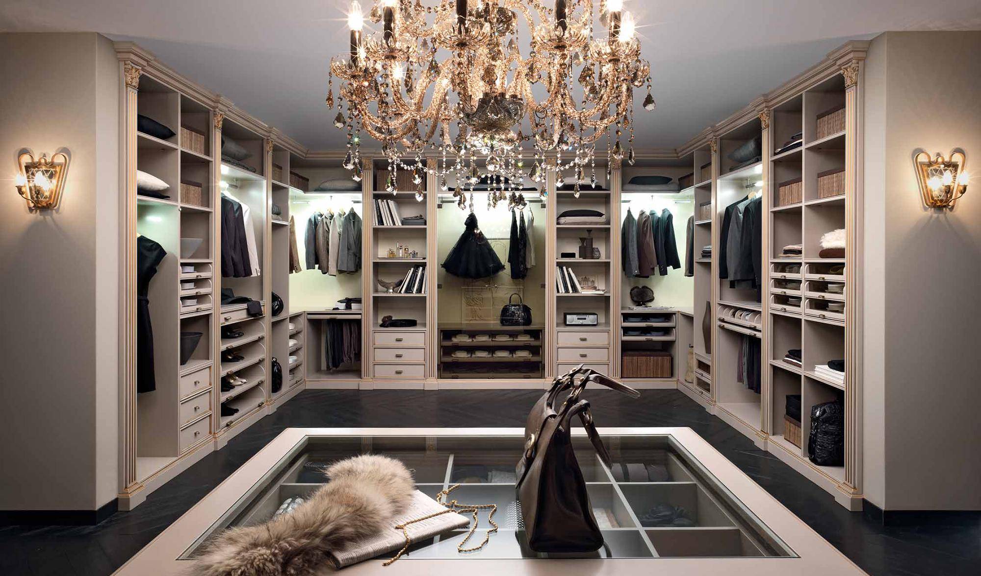 Существует огромное количество вариантов её обустройства. По своей сути гардеробная является тем же шкафом, но огромных размеров. В ней расположено большое количество разнообразных полочек, вешалок и отделений для вещей. Обязательным атрибутом гардеробной комнаты является зеркало.