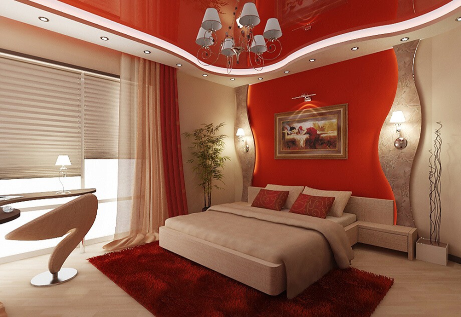 Красный потолок сочетается с лепниной, бордюрами из золота или белого гипса. Гипсокартонный двухуровневый потолок, ниши и переход цвета подойдет для современного интерьера. Натяжной потолок винного или яркого оттенка с точечным освещением подойдет для спальни или зала.