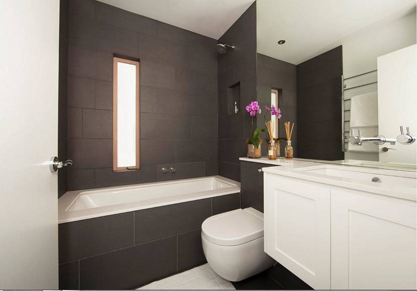 Чтобы ванная при этом не выглядела слишком уж стерильной, светлый цвет разбавляют яркими элементами. Вариантов несколько — бордюр из более темной плитки, темная нижняя часть стены (примерно — нижняя треть). Если нижняя част стены темная, пол делают того же цвета или очень близкого, если не удается найти плитку того же тона.