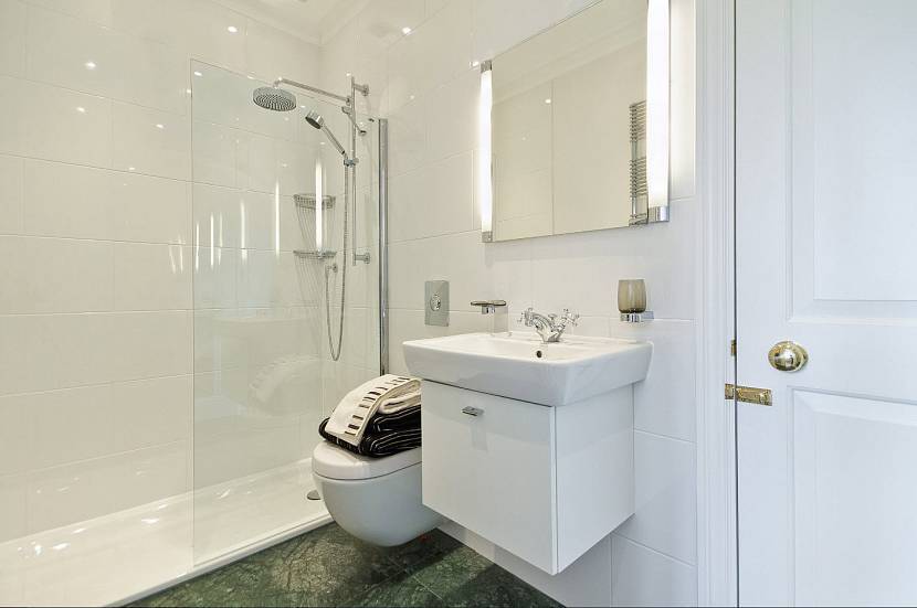 Чтобы еще больше раздвинуть границы, света должно быть много. Следуя последним тенденциям, это обычно встроенные потолочные светильники. На такую площадь по нормам требуется одна лампочка средней мощности, но лучше поставить две или еще больше, а еще — подсветку возле зеркала.