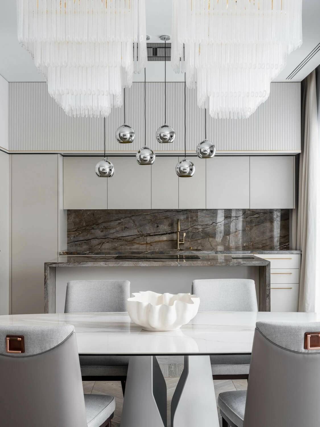 Основная идея – создание актуальной стильной кухни с нотками экстравагантности. При выборе мебели предпочтение отдается стеклянным и металлическим фасадам строгих форм со скрытой фурнитурой.