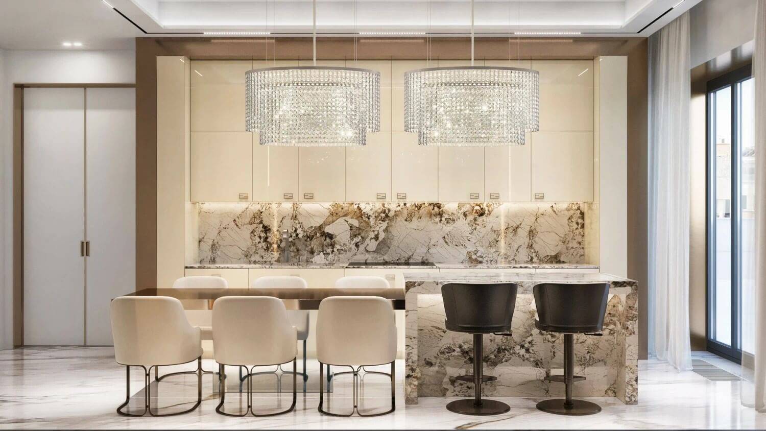 Гарнитур из дорогих пород дерева с резными фасадами и столешницами из камня, обитые тканью стулья, буфет, хрустальная люстра и лепнина на потолке – все это неизменные атрибуты классики.