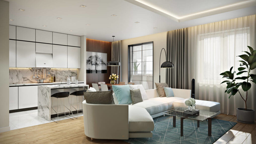 Главной задачей при объединении кухни и соседней комнаты, будет не допустить захламленности интерьера излишними декоративными элементами, мебелью и техникой. Главный тренд дизайна помещений — зрительное расширение площади.