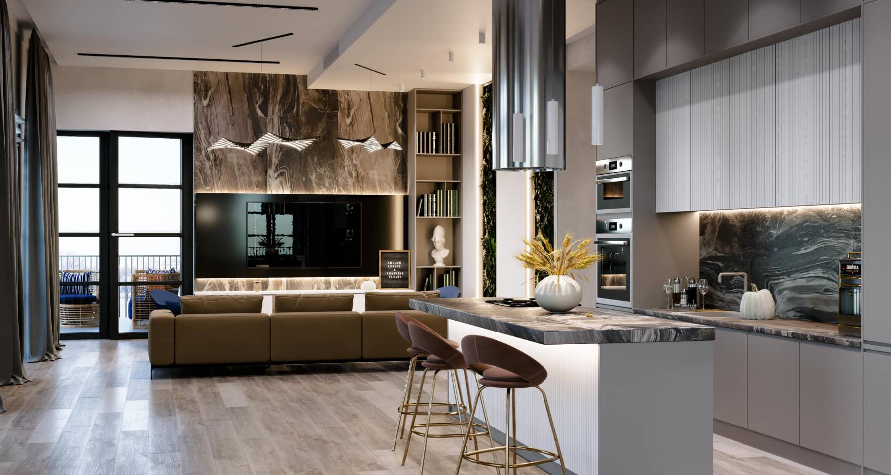 Такая кухня 2023 современная – это помещение, которое легче разделить на функциональные зоны.