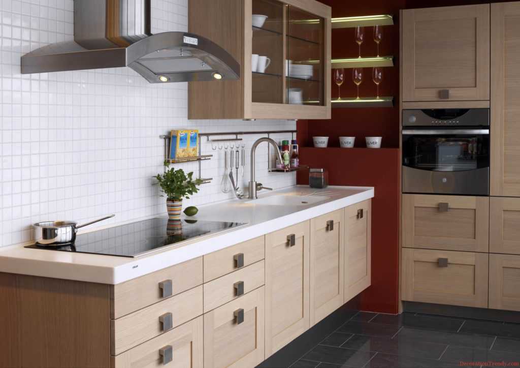 Третье популярное решение – расстановка мебели в форме буквы I. В этом случае кухонная мебель расположена только на одной стене, обеспечивая большую свободную полезную площадь. Маленькая кухонька не будет иметь слишком много рабочих поверхностей и вместительных полок, но сохранит свою функциональность. Даже узкая кухня, расположенная в одной кухонной последовательности, может приобрести привлекательный внешний вид и большие декоративные качества.