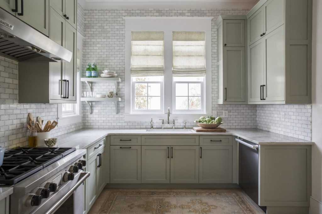 Прованский интерьер ограничивается пастельной и выцветшей гаммой. Для более выразительного подчеркивания аутентичной эстетики стиля, фасады декорируют патиной, а помещение дополняют открытыми полками или стеклянными шкафчиками с посудным сервизом.