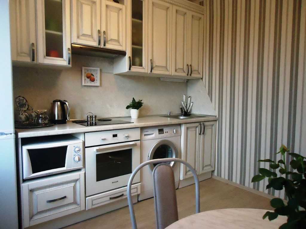 Предпочтительнее встроенная бытовая техника, не бросающаяся в глаза, а тщательно замаскированная под общее цветовое оформление комнаты.