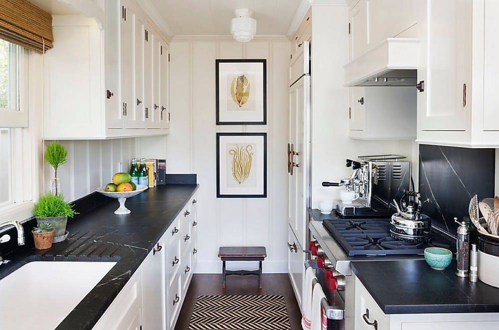 Много естественного света на кухне с двумя рабочими зонами вдоль противоположных стен, помогает создать функциональный и светлый интерьер