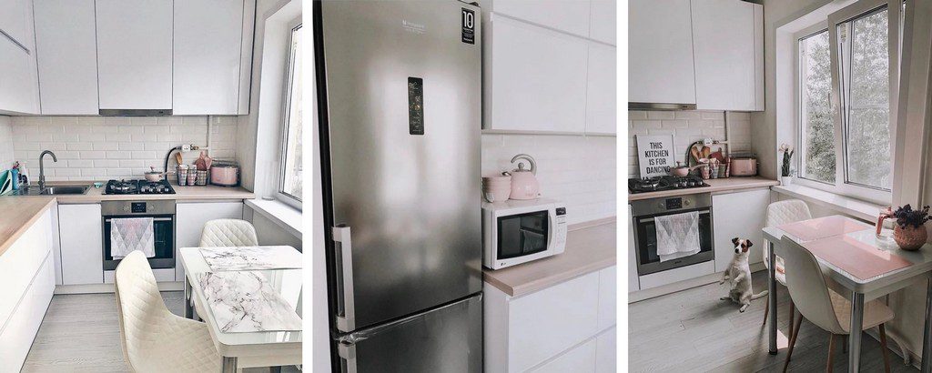 Например, техника цвета металлик тоже будет предметом с ценной для маленькой кухни отражающей поверхностью. А если гарнитур предполагает шкаф для холодильника, и все это не выглядит громоздко, – это здравое решение. И еще, не ставьте его так, чтобы он загораживал световой поток.
