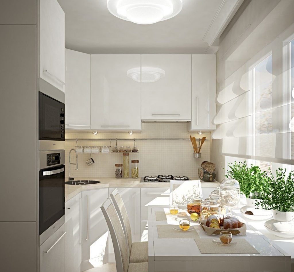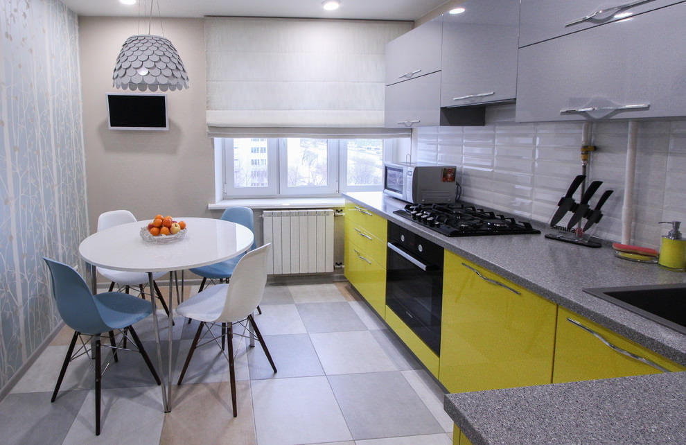 Третий вариант современной планировки – гарнитур, располагающийся вдоль двух стен; он займет гораздо больше пространства. Учитывая данный факт, подобная планировка оптимальна для помещений, обладающих прямоугольной формой. Маленький стол будет органично смотреться в зоне рядом с окном между наиболее длинными стенами.
