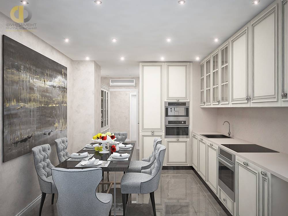 Это изысканный и роскошный дизайн, который не теряет своей актуальности уже долгие годы. Он эффектно смотрится в кухнях 9 м2 с высокими потолками, украшенными лепниной, что характерно для старых сталинских домов. Для отделки стен подойдут тканевые обои, однотонная декоративная штукатурка, панели МДФ или ДСП, а в качестве напольного покрытия – ламинат или керамическая плитка. Основные цвета интерьера кухни 9 кв. м в классическом стиле: оливковый, шоколадный, коньячный, бежевый, песочный.