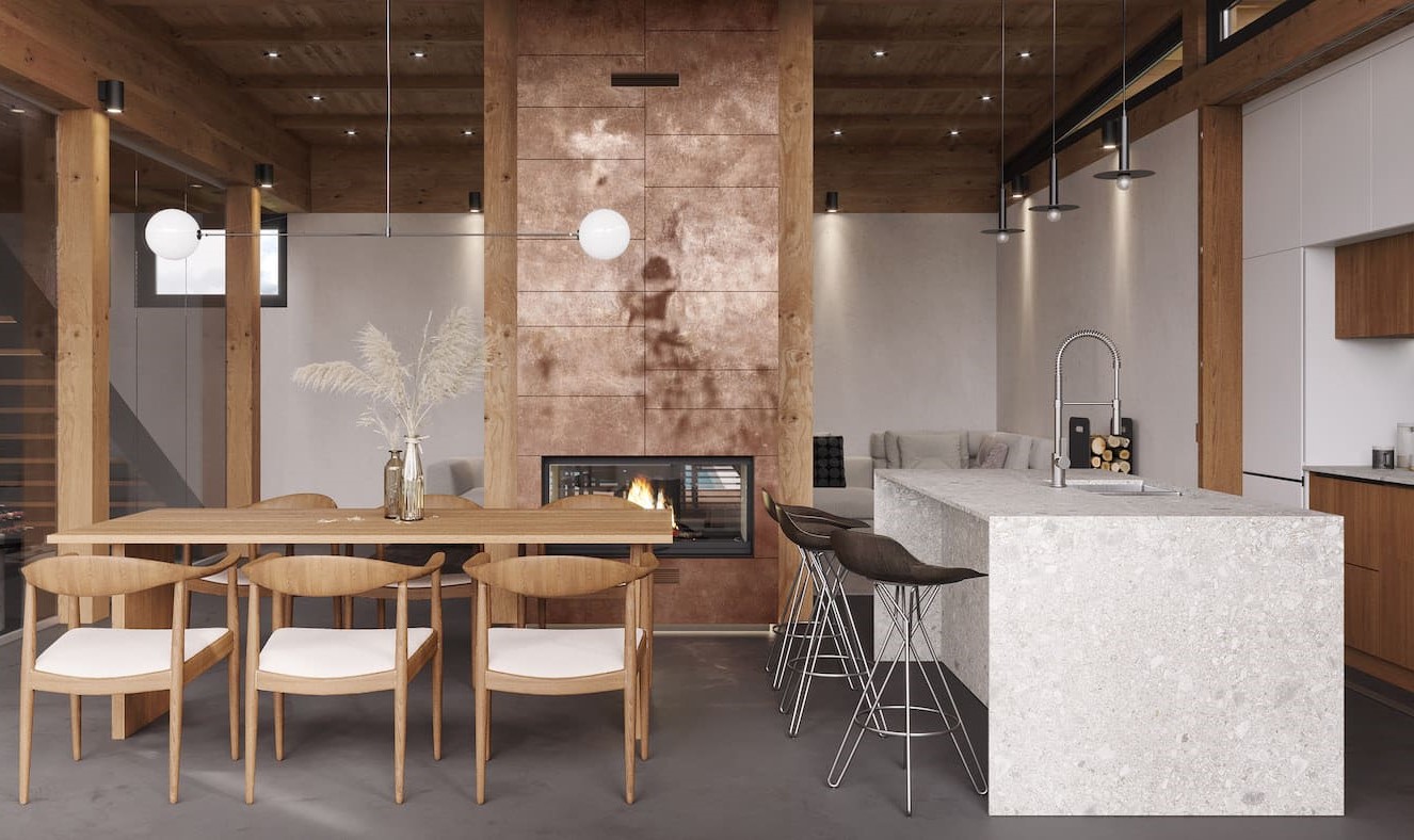 Размер обеденного стола зависит от того, сколько человек проживает в квартире. Если обеденная зона предназначена для быстрого перекуса, следует установить стильную барную стойку со складными стульями.
