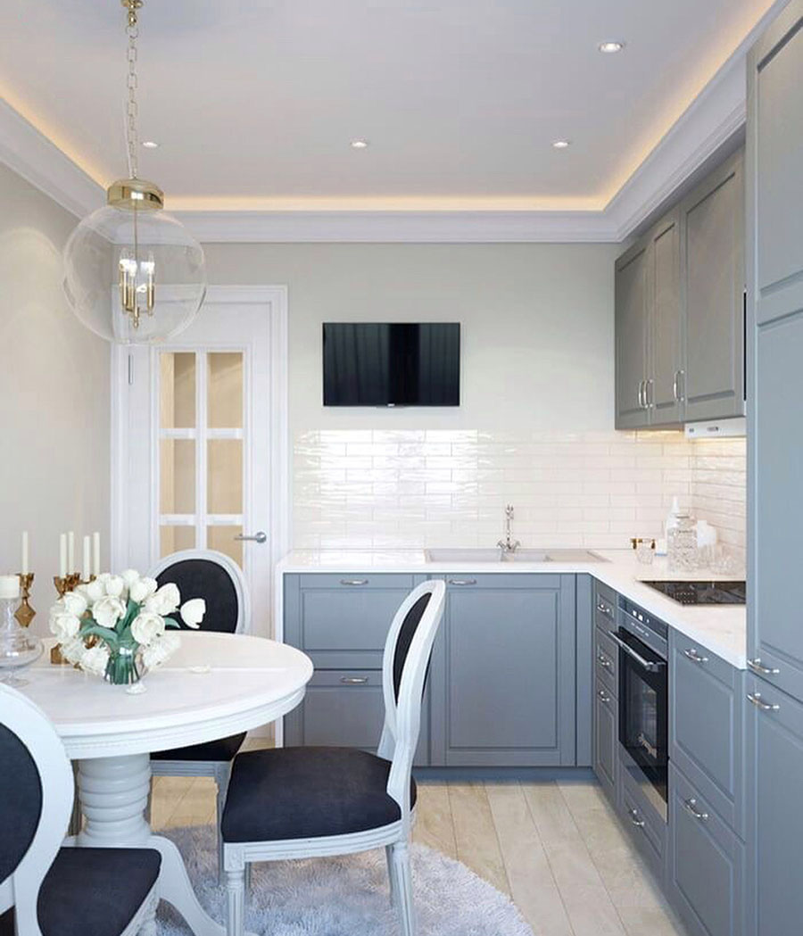 В дизайне кухни 9 квадратных метров используется плоская и легкая модель телевизора, которая вешается на стену, гарнитур закрепляется на фасаде или встраивается в него. Телевизор также можно разместить в свободном углу, который будет виден из любой точки комнаты.