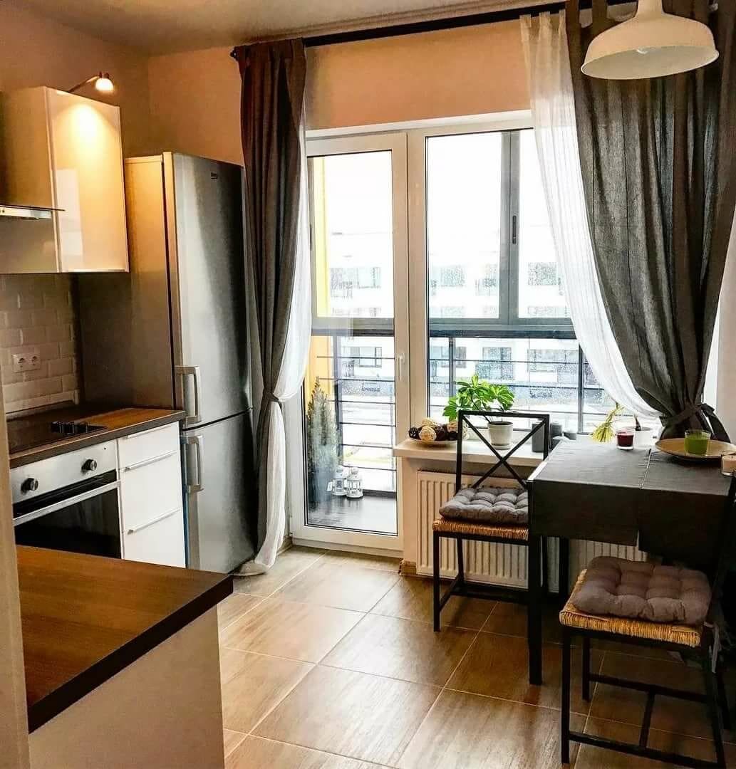 Двухрядный гарнитур будет хорошим решением в узкой кухне 9 кв.м, если требуется много рабочей поверхности и мест хранения. Для организации обеденной зоны есть несколько практичных решений ‑ барная стойка, пристенноый навесной стол, стол-подоконник.