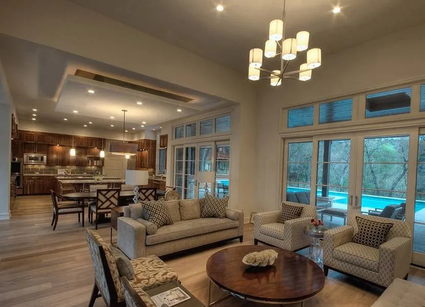 Чтобы времяпрепровождение в совмещенной кухне-гостиной было комфортным, необходимо позаботиться о достаточном количестве источников света. В идеале каждая зона должна оснащаться отдельной системой, которая позволит наиболее рационально организовать общее освещение и визуально зонировать площадь.