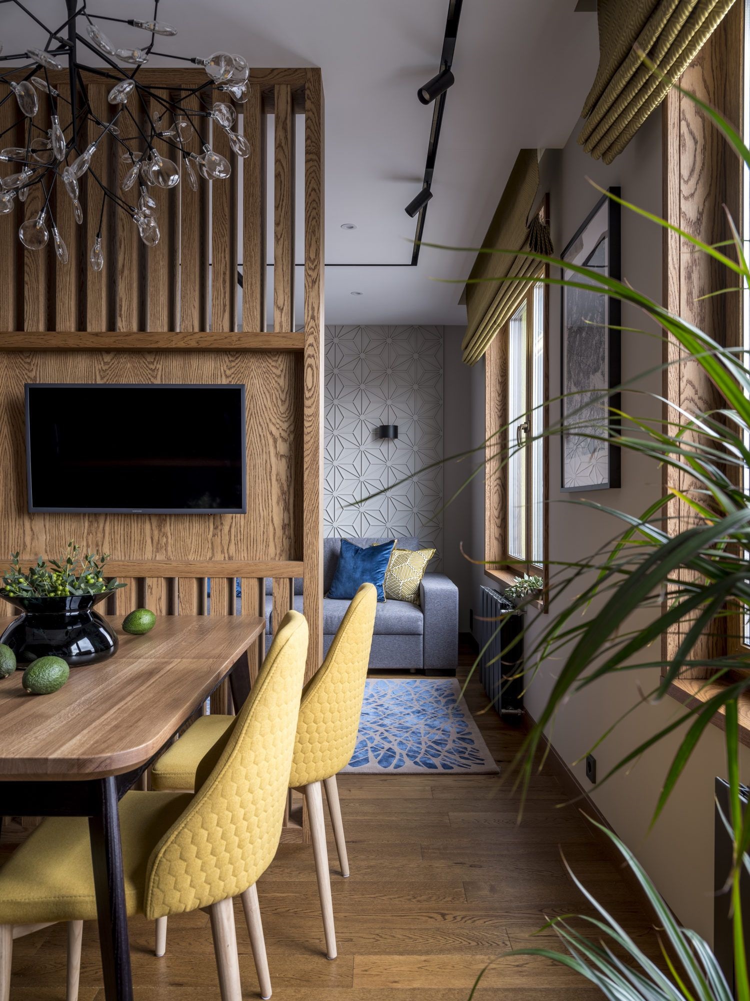 Многие дизайнеры предпочитают использовать для зонирования помещения обеденный стол