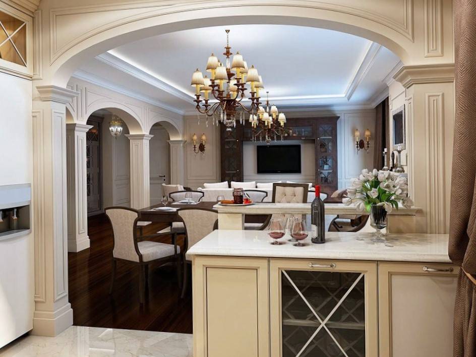 Арки – вариант оформления перегородок в дизайн-проектах кухни-гостиной , более характерный для классических интерьеров. Ещё лучше, если он будет иметь тот же дизайн, что и кухонный фасад. Это сделает дизайн кухни-гостиной максимально гармоничным.