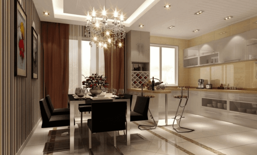 Идеи для дизайна объединенной кухни и зала очень разнообразны, однако включают 1 обязательно условие: свободное пространство и незагроможденность мебелью. Это требование делает почти невозможным оформление в классических стилях.