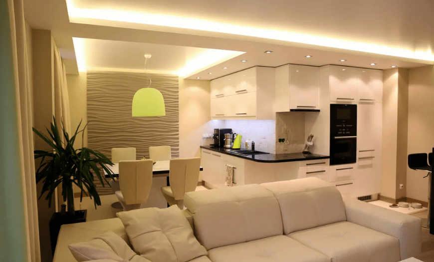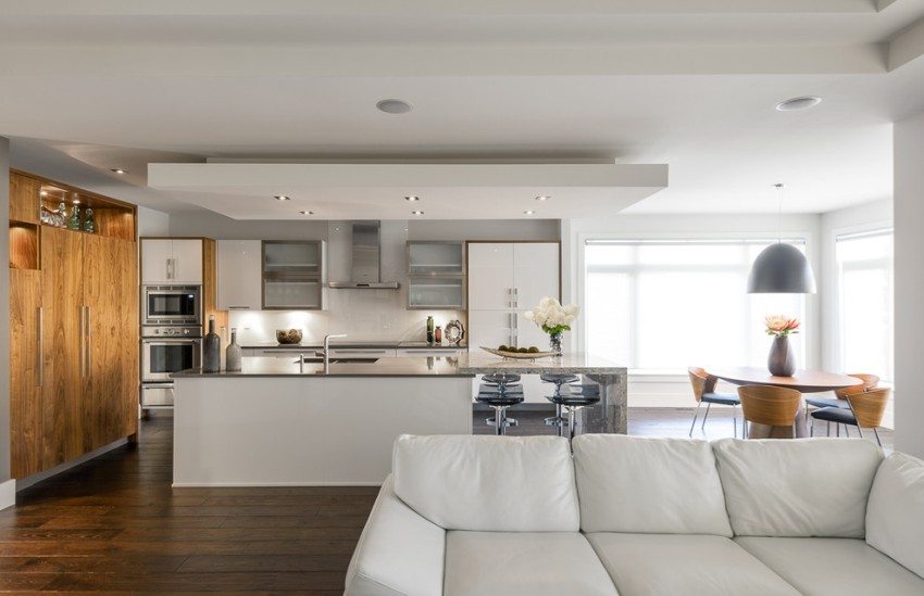 Потолочные поверхности также могут помогать в зонировании пространства современной кухни-гостиной. Для этого можно использовать многоуровневые потолки. Такое решение добавит романтической и даже праздничной атмосферы в зону гостиной, а на кухне обеспечит рабочую атмосферу и лучший уровень освещения.