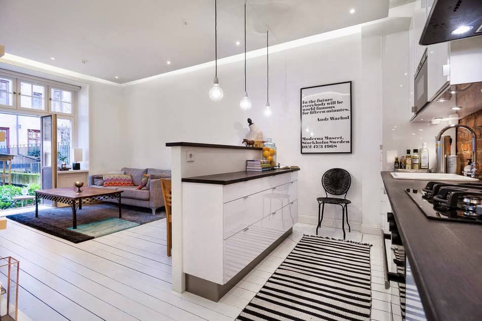 Использование отделки стен, отличающихся друг от друга, но образующих красивый дуэт, также является интересным вариантом того, как разделить кухню-гостиную.