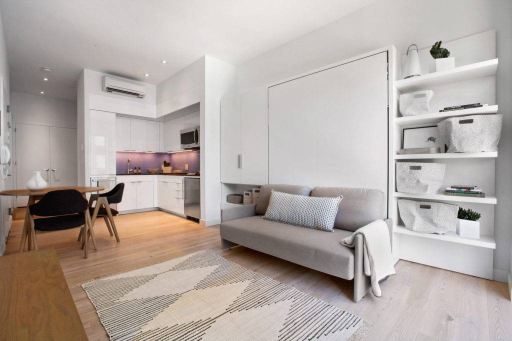 В квартирах-студиях единое пространство охватывает также прихожую, спальню и кабинет, а границы подчёркиваются только за счёт перепадов уровня пола или раздвижных перегородок.