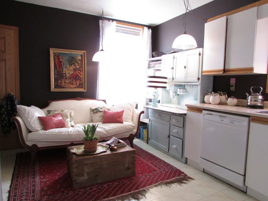 Многие практикуют г-образный диван, который идет вдоль стены и упирается в угловой кухонный гарнитур, но этот вариант подойдет только для длинной и узкой комнаты.