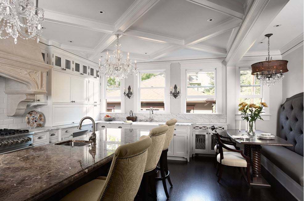 Данная стилистика предпочитает кушетки или модели, имеющие более помпезные формы, декор в виде каретной стяжки, резных, кованых элементов и дорогую тканевую или кожаную обивку. Главное на кухне в классическом стиле, это соблюдение строгой интерьерной композиции при размещении данного мебельного предмета.