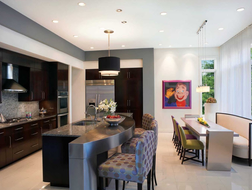 С-образная планировка – современная, смелая идея для обустройства кухни-гостиной. Посмотреть, как выглядят кухни 16 кв метров такого необычного дизайна интерьера можно на фото, представленных в этой публикации. Данный вид планировки используется для сглаживания углов. В этом случае кухонный гарнитур выстраивается полукругом. Дополнить его можно полукруглой барной стойкой. Зоны отдыха, столовой размещаются в углу.
