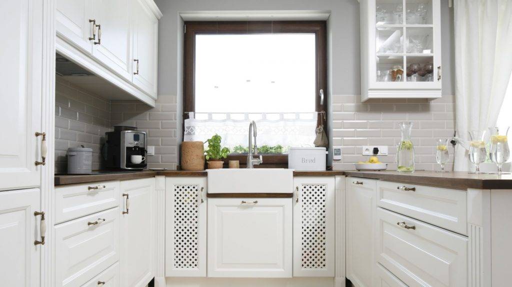 Планировка кухни с раковиной у окна прекрасно подойдет для действительно маленьких помещений и красивого вида за окном. Но помимо красоты есть и недостатки, например, в необходимости каждый день протирать стекло от брызг, сложности проводки труб и так далее.