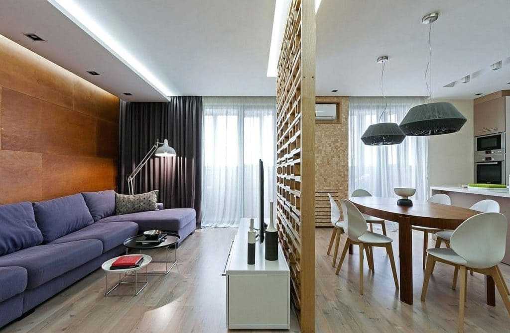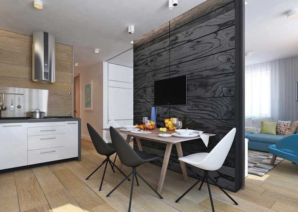 Следует отделить зону приема пищи от гостиной, а вот несколько идей для зонирования: