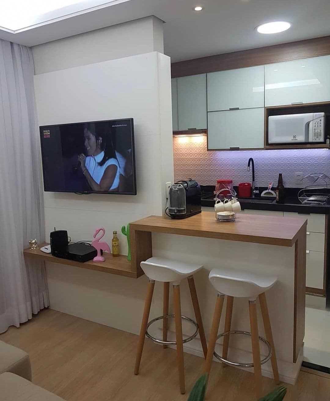 Квартира студия на то и придумана, чтобы комнатки в малогабаритных помещениях не казались тесными и неуютными. Как насчёт мини-кухни прямо в вашей гостиной, а?
