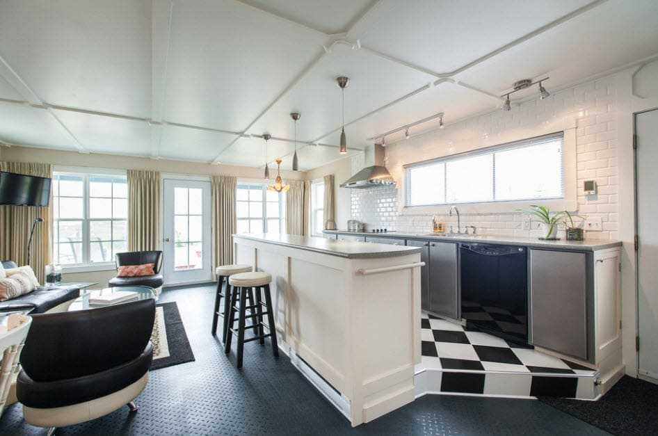 Форма комнаты имеет значение в лофте: длинная комната будет испорчена, если поставить кухонный гарнитур вдоль стен. Если площадь позволяет, лучше включить в интерьер остров, он поделит помещение на функциональные зоны и окажется очень полезным.