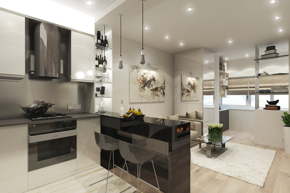 В студии, соединяющей в одном пространстве и кухню, и гостиную, разделить пространство получится при помощи аккуратного шкафа. Таким образом не только появится дополнительное место для хранения, но и удастся разделить, по сути, одну комнату на 2 составляющие. Заднюю стенку при этом рекомендуется как-то оформить, к примеру, повесить плакат или заполнить ее фотографиями. Безусловно, зонировать пространство удастся таким распространенным объектом, как барная стойка. Ее применение характерно как для индивидуальных кухонь, так и для пространств, объединенных с гостиной. Барная стойка является спасением для небольшого пространства, ведь она не только справляется с делением помещения, но и заменяет при необходимости обеденный стол. К тому же наличие данного элемента интерьера сразу же осовременивает интерьер.