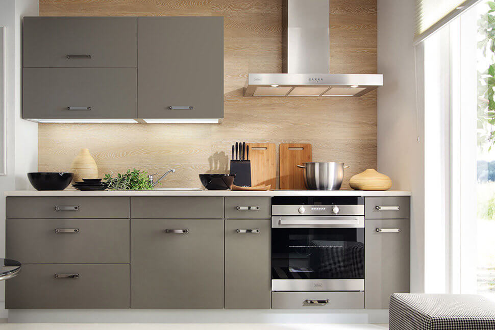 - Меньше деталей. Чем меньше дробится фасад гарнитура, тем целостней будет общий интерьер. Разместите два высоких модуля вместо четырех стандартных, широкие вместо узких. Гладкие ровные фасады со скрытыми ручками или системой “нажал-открыл” незаметны в студийной площади.
