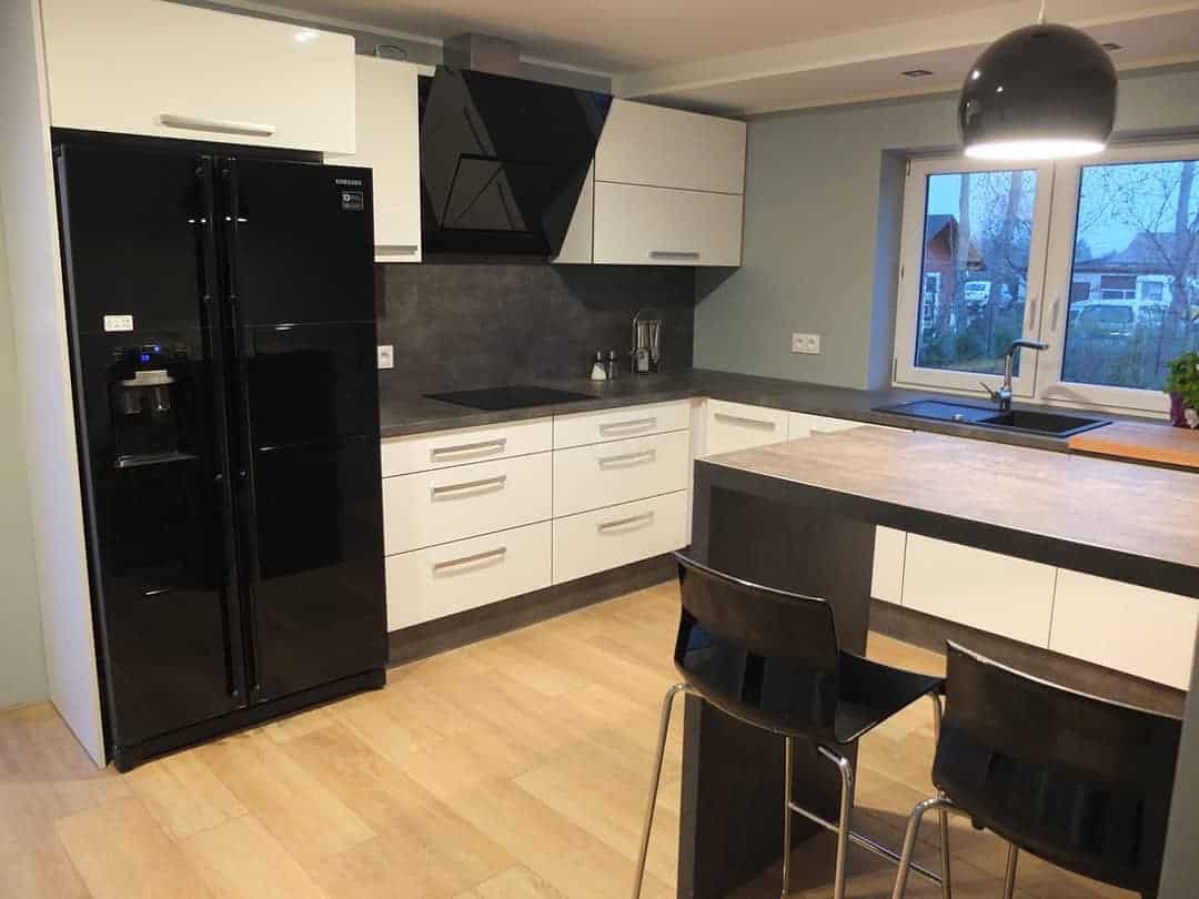 Благодаря большей площади, вы можете разместить на кухне миниатюрный диван, стиральную машинку, дополнительные тумбы для хранения или барную стойку.