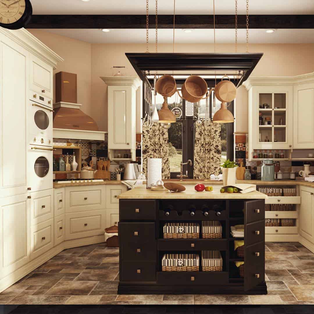 - теплота и старинный уют, проявляющийся в массивных кухонных гарнитурах, сложных портьерах, стеклах, позолоте, украшениях.