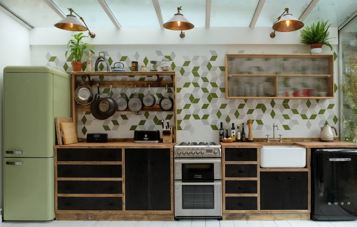 - Стиль допускает одновременное присутствие бытовой техники последнего поколения и раритетных моделей. Например, рядом с инновационной стильной вытяжкой может соседствовать прабабушкин холодильник, выкрашенный в апельсиновый цвет.