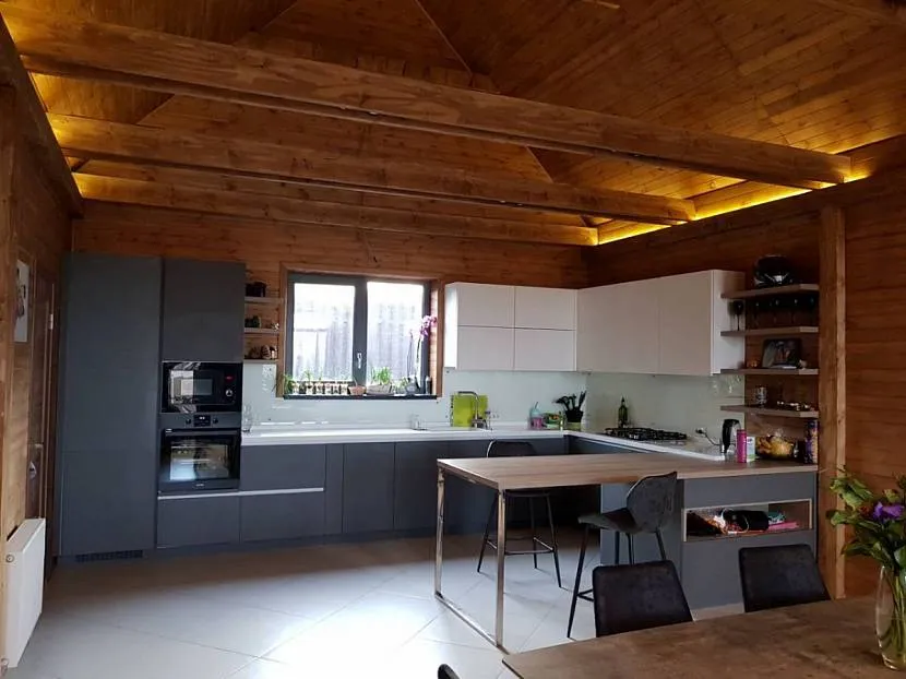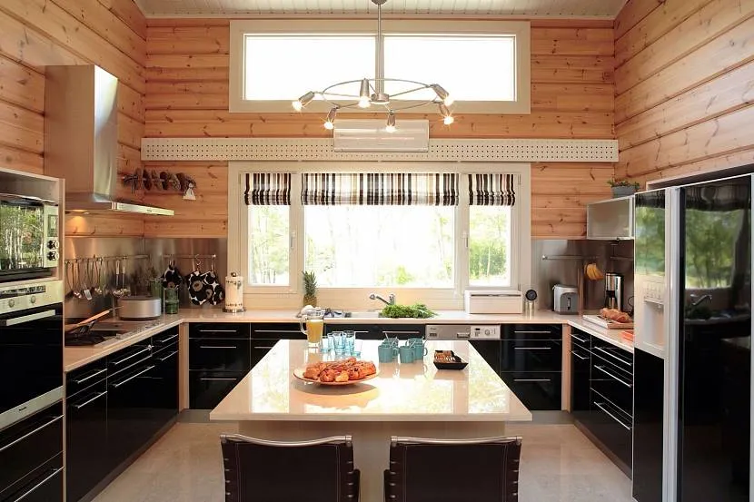 Очень неплохо смотрится помещение с облицовкой из дерева и установленной глянцевой мебелью. В темно-коричневом фоне комнаты можно разместить гарнитур с верхними шкафчиками в пепельном или сером оттенке. Такой интерьер кухни в деревянном доме идеален для встраиваемой бытовой техники.