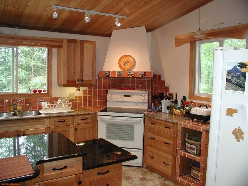 Дизайн кухни может быть оформлен в стиле кантри, рустика, фьюжн, неоклассика, скандинавский, прованс. Стены лучше оставить натуральными, бревенчатыми, но, в зависимости от используемого стиля, их покрывают штукатуркой и красят. Фартук на кухне лучше сделать из керамической плитки. Часто его выкладывают в стиле пэчворк – он хорошо сочетается с деревенским стилем.